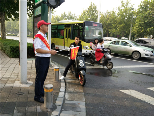 此次活动分为上午7:30—8:30,下午6:00—7:00两个时段进行,一组四人,每天两组志愿者轮流执勤。志愿者们头戴小红帽,身披红色绶带,手举小红旗,在黄河东路众意西路交叉的四个路口处分别进行引导活动,通过劝阻横穿马路、乱闯红灯等不文明行为,引导市民遵守交通法规,文明行路、文明行车。针对黄河东路众意西路交叉口车流量大,电动车等行人众多的问题,志愿者通过举落小红旗,引导行人通过斑马线安全过马路,提醒过往行人提高文明出行和交通安全意识。同时,志愿者还热心搀扶老人、孕妇等特殊群体过马路。